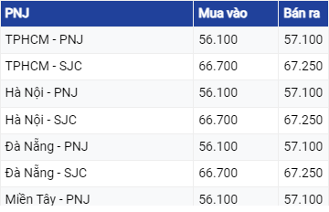 Giá vàng PNJ niêm yết ở mức 66,7 triệu đồng/lượng mua vào và 67,25 triệu đồng/lượng bán ra. Vàng Bảo Tín Minh Châu đang thu mua mức 66,7 triệu đồng/lượng và bán ra mức 67,28 triệu đồng/lượng.
