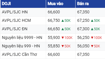 Giá vàng SJC tại Tập đoàn Doji, niêm yết trên thị trường Hà Nội, mua - bán quanh mức 66,6 – 67,35 triệu đồng/lượng, đi ngang cả chiều mua vào và chiều bán ra so với chốt phiên trước. Chênh lệch mua - bán là 700.000 đồng/lượng.