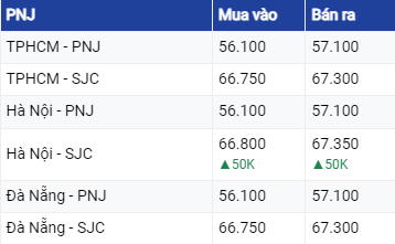 Giá vàng PNJ niêm yết ở mức 66,75 triệu đồng/lượng mua vào và 67,3 triệu đồng/lượng bán ra.