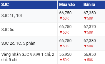 Tại Hà Nội và Đà Nẵng, giá vàng SJC giao dịch mua - bán trong khoảng 66,75 – 67,37 triệu đồng/lượng. Các thị trường trên đều giảm 50.000 đồng/lượng cả chiều mua và chiều bán ra so với chốt phiên trước. Chênh lệch mua – bán ở mức 600.000 đồng/lượng. So với phiên hôm qua, các thị trường trên đã tăng 150.000 đồng/lượng.