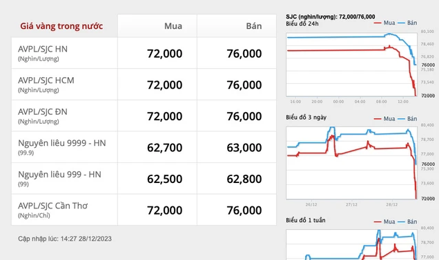 Ghi nhận lúc 14 giờ ngày 28/12, giá vàng SJC được Công ty Vàng bạc Đá quý Sài Gòn (SJC) niêm yết mua vào 74 triệu đồng/lượng, bán ra 77 triệu đồng/lượng, giảm 1 triệu đồng/lượng so với buổi sáng.
