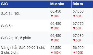 Giá vàng SJC tại Tập đoàn Doji, niêm yết trên thị trường Hà Nội, mua - bán quanh mức 66,45 – 67,05 triệu đồng/lượng, đi ngang cả chiều mua vào và chiều bán ra so với chốt phiên trước. Chênh lệch mua - bán là 600.000 đồng/lượng.