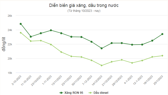 | Giá xăng dầu được dự báo tăng nhẹ vào ngày mai (18/1) Giá xăng dầu đồng loạt tăng, RON95 vượt 22.000 đồng/lít Giá xăng dầu được dự báo tăng mạnh vào ngày mai (25/1) |