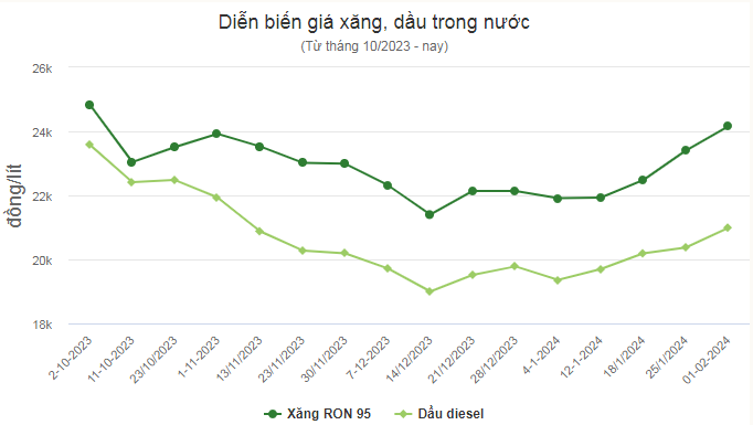 | Giá xăng dầu được dự báo tăng mạnh vào ngày mai (25/1) Giá xăng dầu đồng loạt tăng, RON 95 tăng gần 1.000 đồng/lít Giá điện, giá gạo tăng đẩy CPI tháng 1/2024 tăng 0,31% |