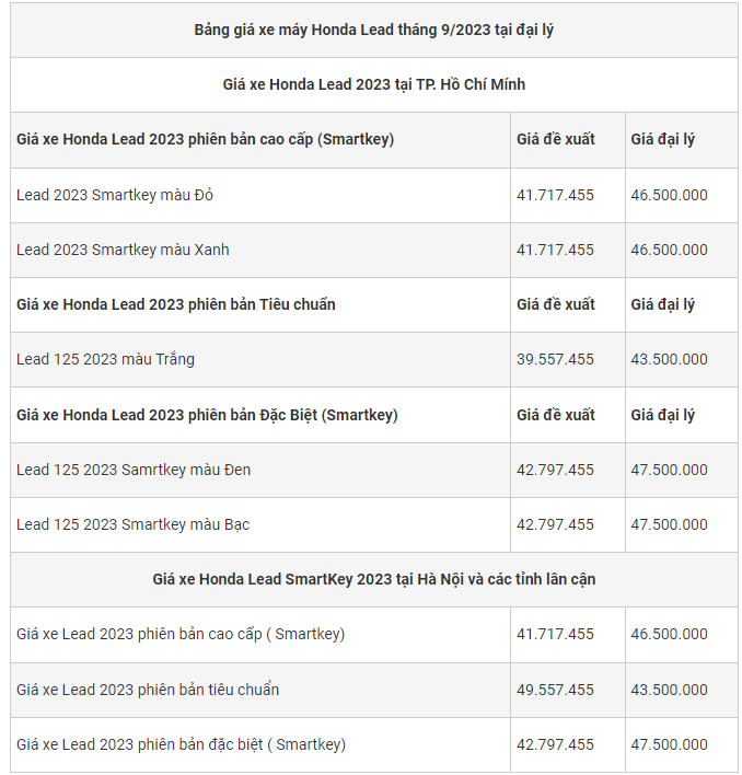 Hiện nay tại các đại lý của Honda Lead 2023 đang có sự giảm giá nhẹ so với tháng trước. Trong đó có phiên bản tiêu chuẩn đang được các đại lý bán với mức thấp hơn so với giá đề xuất.
