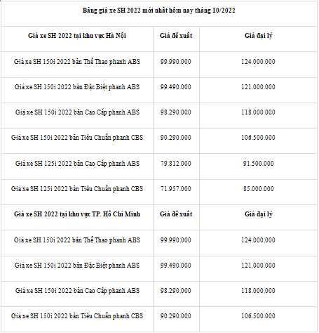 Đầu tháng 10, giá xe máy Honda SH 2022 vẫn đang ở mức ổn định và không quá chênh lệch so với giá bán của tháng 9 trước đó. Hiện tại, Honda SH 2022 vẫn đang được bán ra với mức giá niêm yết thấp nhất là 72 triệu đồng đối với bản 125i CBS và cao nhất là 99,99 triệu đồng đối với bản 150i Thể thao.