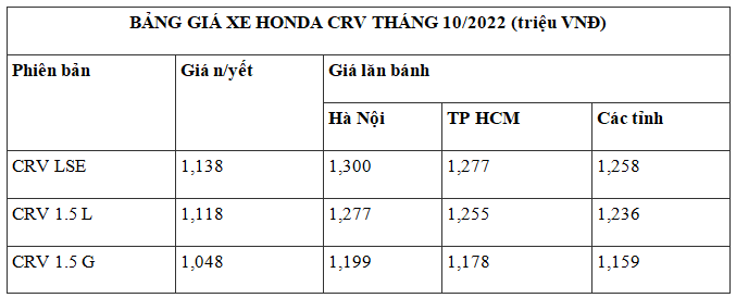 Bảng giá xe Honda CRV 2022 phiên bản 7 chỗ nửa cuối tháng 10/2022