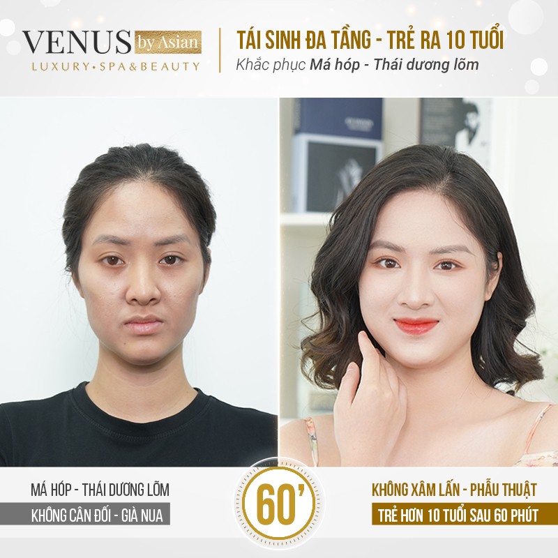 Chị Thanh Hà (35 tuổi, Nghệ An): “Đã uống rất nhiều collagen mà vẫn không cải thiện được má hóp. Tưởng chừng như hết hy vọng, nhưng tình cờ lướt trên mạng thấy cách trị má hóp bằng phương pháp Tái sinh đa tầng. Mình tìm hiểu rất kỹ và quyết định tìm đến Venus by Asian để thực hiện. Chỉ sau 60 phút, vùng má hóp của mình đã được làm đầy. Giờ đây gương mặt đã trở nên đầy đặn và tràn đầy sức sống hơn cả thời con gái.