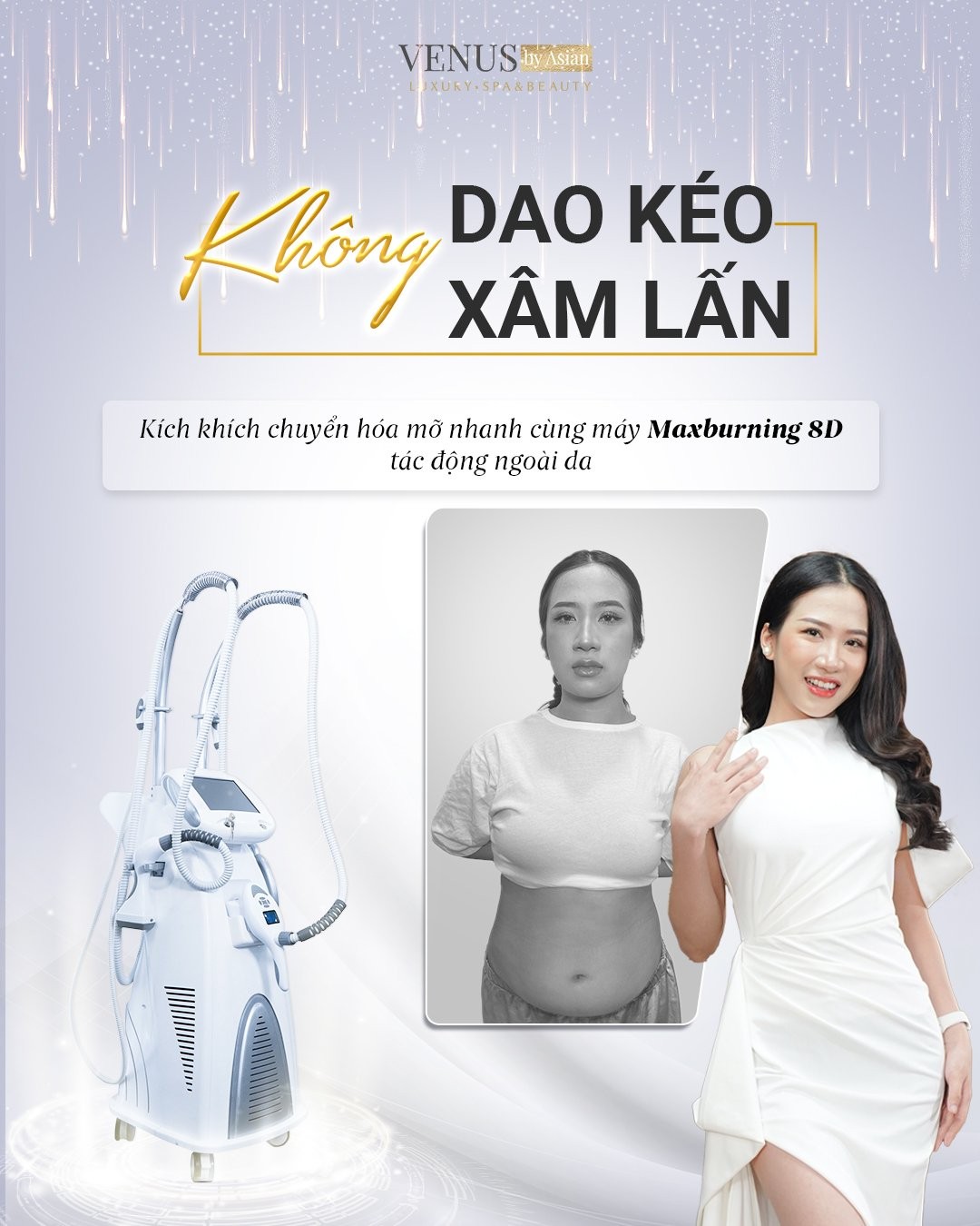 Hiện nay, công nghệ Giảm béo đa tầng MaxBurning được chuyển giao độc quyền từ tập đoàn MER (Đức) cho Phòng khám thẩm mỹ Venus by Asian. Với cuộc sống bận rộn khiến bạn không có thời gian giảm béo và đã thử trăm phương ngàn kế nhưng vẫn thất bại thì hãy đến ngay với Venus by Asian để trải nghiệm công nghệ giảm béo này nhé.