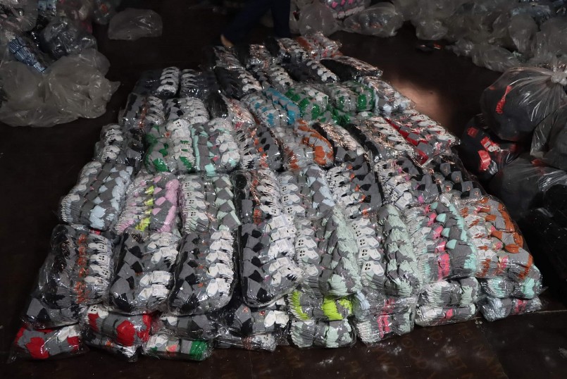 | Lực lượng chức năng bất ngờ kiểm tra, phát hiện xưởng sản xuất hàng chục nghìn đôi tất giả nhãn hiệu. (Ảnh: DMS) |