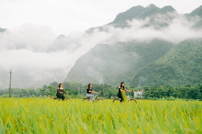 | Du khách thong thả đạp xe giữa cánh đồng lúa chín tại Mai Châu. |