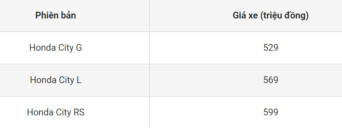 Tại Việt Nam, Honda City có 3 tùy chọn phiên bản cùng giá niêm yết chính hãng như sau: