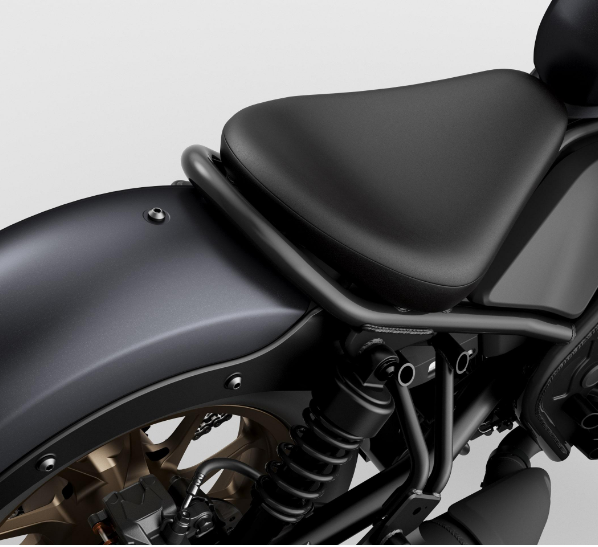 Nét rắn rỏi của Rebel 500 càng được thể hiện rõ trên Hệ thống giảm xóc sau đôi và bộ ống xả mạnh mẽ. Khung thép đen tuyền, càng sau dạng ống cùng tấm chắn bùn sau bằng kim loại mang đến một ấn tượng khác biệt cho Rebel khi chiêm ngưỡng từ phía sau. Mặt đồng hồ tròn tối giản, nhỏ gọn với đường kính 100mm, màn hình LCD âm bản, cùng tính năng hiển thị cấp số giúp người lái dễ dàng theo dõi thông tin của xe khi điều khiển.