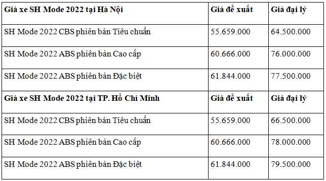 Hiện tại ở thị trường Việt Nam, SH Mode được phân phối với 3 phiên bản khác nhau. Giá bán ra của SH Mode thường chênh cao hơn so với giá niêm yết của nhà sản xuất.