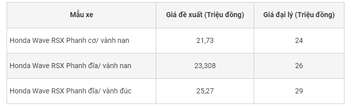 Theo HEAD Honda này cho biết, giá xe Wave RSX bao giấy ở Thành phố Hồ Chí Minh dao động từ 24-29 triệu đồng, tùy theo từng phiên bản. Nếu trừ đi phí bao giấy (phí đăng ký biển số ở khu vực I, phí bảo hiểm, phí trước bạ, thuế VAT) thì Wave RSX có giá tương đương hoặc nhỉnh hơn một chút so với giá đề xuất.