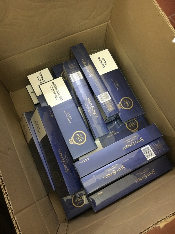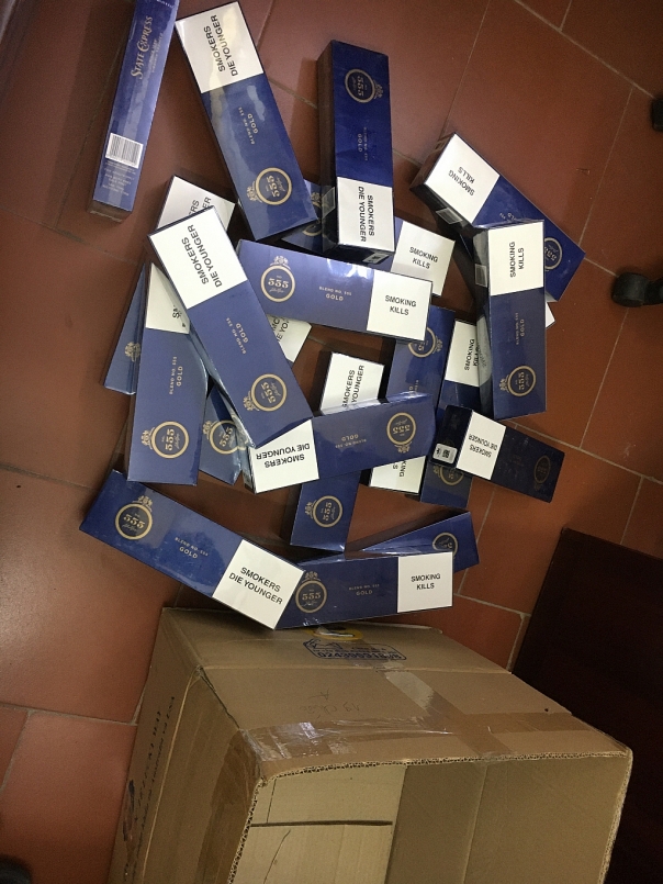 Tiến hành khám xe lực lượng chức năng phát hiện trên xe có 200 bao (20 cây) thuốc lá 555 không có tem thuốc lá, không hóa đơn chứng từ.