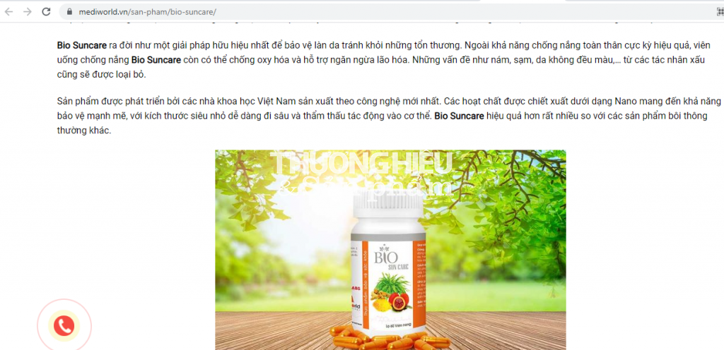 Cụ thể, trên website https://mediworld.vn/san-pham/bio-suncare/; https://chiaki.vn/ giới thiệu, quảng cáo: BIO SUN CARE là sản phẩm bào chế dạng viên uống công nghệ NANO, giúp cơ thể hấp thu nhanh các hoạt chất làm giảm tác động có hại của ánh mặt trời lên da, hỗ trợ chống nắng toàn thân. Với thành phần chứa chiết xuất cây dương xỉ có nguồn gốc của các khu vực nhiệt đới và cận nhiệt đới của Châu Mỹ đã được chứng minh là có tác động kháng viêm, bảo vệ da khỏi tổn thương gây ra bởi các tia UV.