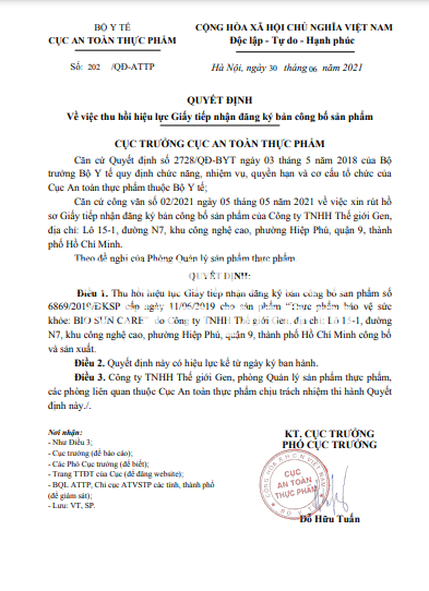 Theo đó, ngày 30/6/2021 Cục An toàn thực phẩm ban hành Quyết định số 202/QĐ-ATTP về việc thu hồi hiệu lực Giấy tiếp nhận đăng ký bản công bố sản phẩm số 6869/2019/ĐKSP cấp ngày 11/06/2019 cho sản phẩm “Thực phẩm bảo vệ sức khỏe: BIO SUN CARE” do Công ty TNHH Thế giới Gen, địa chỉ: Lô 15-1, đường N7, khu công nghệ cao, phường Hiệp Phú, quận 9, thành phố Hồ Chí Minh công bố và sản xuất.