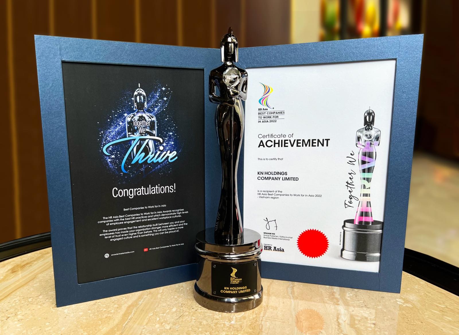 Chứng nhận và cúp Doanh nghiệp có môi trường làm việc tốt nhất tại Châu Á năm 2022 dành cho KN Holdings. |