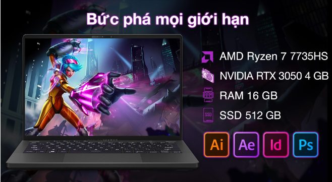Laptop này sở hữu bộ vi xử lý AMD Ryzen 7 7735HS cùng card đồ họa NVIDIA GeForce RTX 3050 4 GB cung cấp hiệu suất xử lý mạnh mẽ, đáp ứng mượt mà cho người dùng với các công việc phức tạp như coding, xử lý đồ họa, hình ảnh 2D, 3D, render video nhanh chóng... hay chiến các tựa game ở mức cấu hình cao.