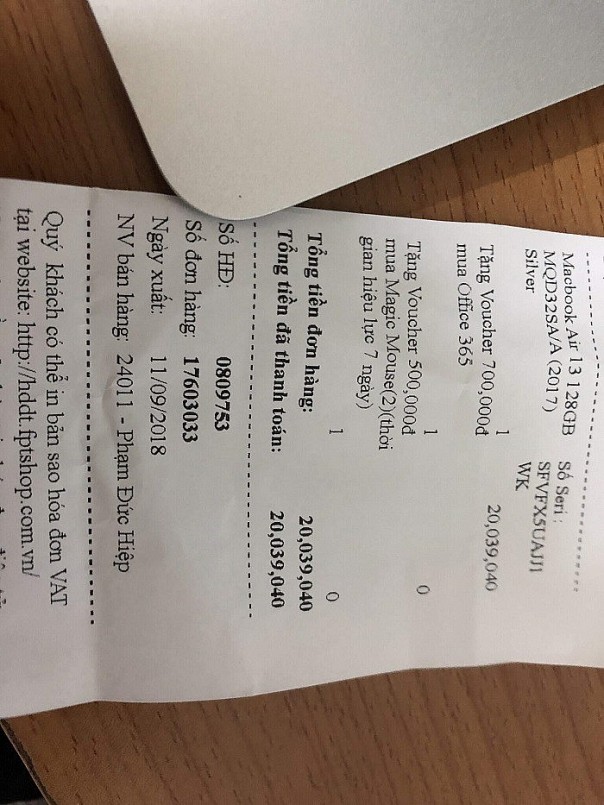 Nếu bạn mua MacBook ở những địa chỉ uy tín thì trên hóa đơn sẽ có đầy đủ các thông tin sản phẩm và bao gồm cả số seri cho bạn kiểm tra.