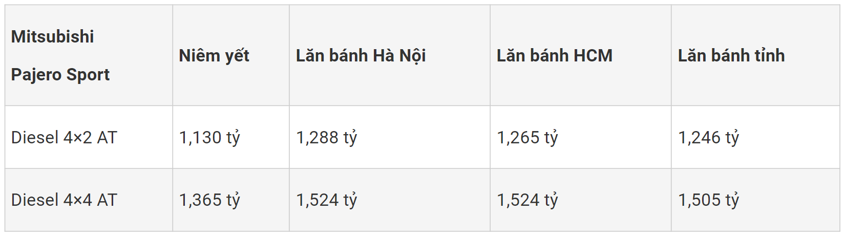 Để mẫu xe Mitsubishi Pajero Sport có thể lăn bánh, ngoài khoản giá mua xe, khách hàng sẽ phải bỏ ra nhiều khoản thuế, phí khác nhau (tùy vào tỉnh, thành). Trong đó, có sự khác biệt về cách tính lệ phí trước bạ, cụ thể: 12 % đối với Hà Nội, Quảng Ninh, Hải Phòng, Lào Cai, Cao Bằng, Lạng Sơn, Sơn La, Cần Thơ; 11% đối với Hà Tĩnh; 10% đối với TP HCM và các tỉnh khác.