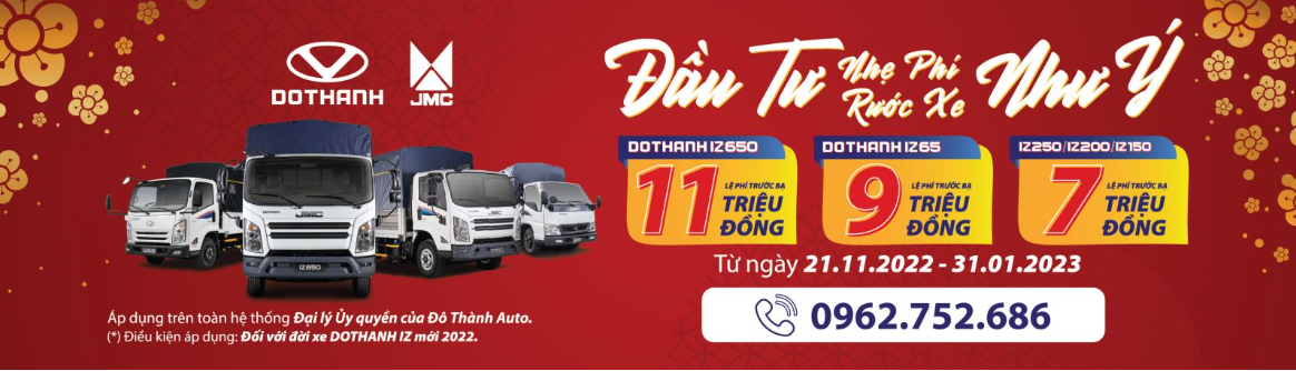 Với mong muốn san sẻ nỗi lo chi phí đầu tư xe, sẵn sàng cho các hoạt động vận tải cuối năm và đón Tết, DoThanh Auto triển khai chương trình ưu đãi lệ phí trước bạ “Đầu Tư Nhẹ Phí - Rước Xe Như Ý” dành cho khách hàng mua xe tải DOTHANH IZ đến hết Tháng 01/2023.