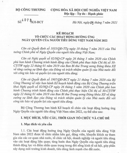 Trong bối cảnh đó, ngày 09 tháng 7 năm 2021, Bộ Công Thương đã ban hành Kế hoạch số 4073/KH-BCT đề xuất hoạt động và lựa chọn chủ đề cho các hoạt động hưởng ứng Ngày Quyền của người tiêu dùng Việt Nam năm 2022 là: “Tiêu dùng an toàn trong thời kỳ bình thường mới”.