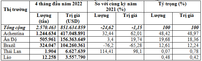 Achentina là thị trường cung cấp ngô nhiều nhất cho Việt Nam trong 4 tháng đầu năm 2022, chiếm 49% trong tổng lượng và tổng kim ngạch nhập khẩu ngô của cả nước, đạt 1,24 triệu tấn, tương đương 417,05 triệu USD, tăng mạnh cả về lượng, kim ngạch và giá so với cùng kỳ năm 2021, với mức tăng tương ứng 32,4%, 62% và 22,3%.