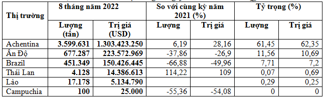 Achentina là thị trường chủ đạo cung cấp ngô cho Việt Nam trong 8 tháng đầu năm 2022, chiếm 61,5% trong tổng lượng và chiếm 62,4% trong tổng kim ngạch nhập khẩu ngô của cả nước, đạt 3,6 triệu tấn, tương đương trên 1,3 tỷ USD, tăng cả về lượng, kim ngạch và giá so với cùng kỳ năm 2021, với mức tăng tương ứng 6,2%, 28,2% và 20,7%.