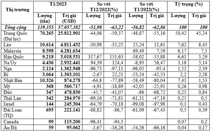 Trong tháng 1/2023 nhập khẩu phân bón từ thị trường chủ đạo Trung Quốc tiếp tục giảm mạnh 44% về lượng, giảm 59,4% kim ngạch, và giảm 27,4% về giá so với tháng 12/2022, đạt 70.265 tấn, tương đương 25,81 triệu USD, giá 367,4 USD/tấn; So với tháng 1/2022 thì giảm 48,9% về lượng, giảm 55,2% kim ngạch và giảm 12,3% về giá.