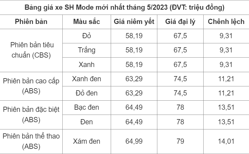 So với tháng 4/2023, giá niêm yết đối với các mẫu xe Honda SH Mode trong tháng này không có sự thay đổi nào. Cụ thể: Phiên bản tiêu chuẩn có giá 58,19 triệu đồng, phiên bản cao cấp có giá 63,29 triệu đồng, phiên bản đặc biệt có giá 64,49 triệu đồng và phiên bản thể thao có giá 64,99 triệu đồng.