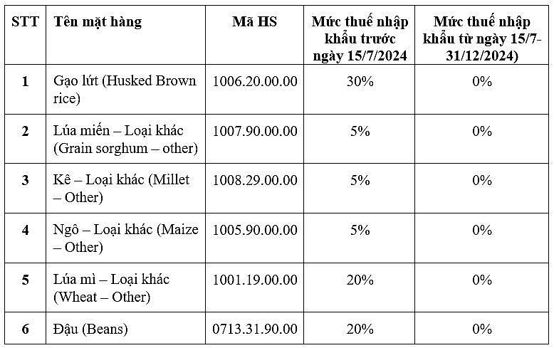 Tổng cục Hải quan Nigeria đã thông báo về việc thực hiện mức thuế nhập khẩu 0% và miễn thuế giá trị gia tăng (VAT) cho một số mặt hàng lương thực nhập khẩu vào Nigeria. Chính sách này sẽ bắt đầu được thực hiện từ ngày 15/7/2024 đến ngày 31/12/2024.