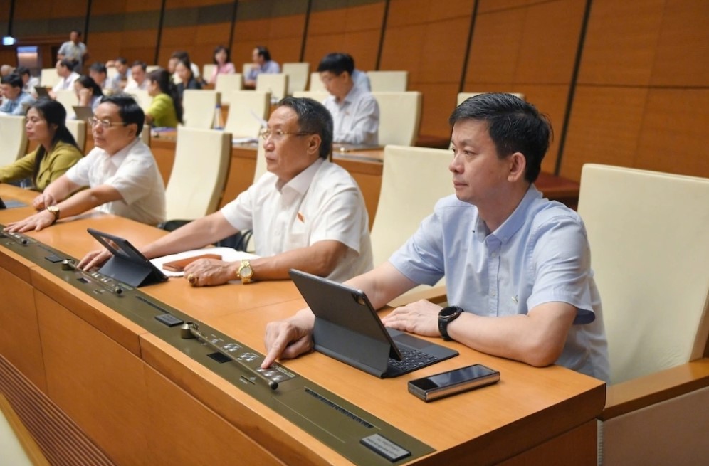| Các đại biểu Quốc hội bấm nút thông qua Luật Thuế tiêu thụ đặc biệt (sửa đổi), sáng 14/6. Ảnh: Trung tâm báo chí Quốc hội |