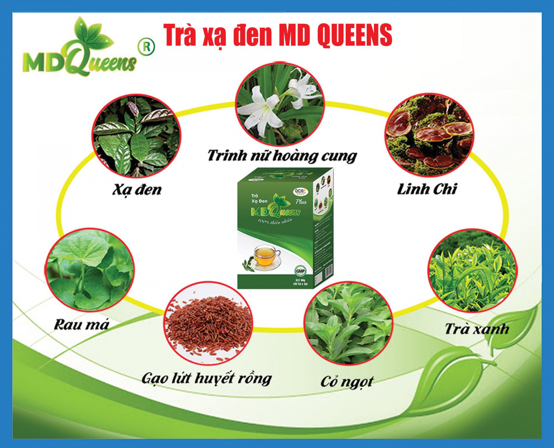 Trà xạ đen MD Queens được thiết kế dạng bột khô trong túi lọc tiện lợi, được sản xuất theo tiêu chuẩn ISO 22000:2018 với 3 tiêu chí không hương liệu, không chất tạo màu, không phụ gia độc hại. Trà có hương vị riêng biệt và tạo được dấu ấn riêng khi kết hợp cây xạ đen với 7 loại thảo mộc thiên nhiên như trinh nữ hoàng cung, trà xanh, rau má, cỏ ngọt, gạo lứt huyết rồng và đặc biệt là nấm linh chi.