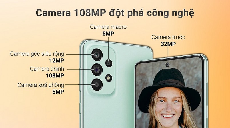 Cụm camera sau của Samsung Galaxy A73 5G bao gồm camera chính 108MP khẩu độ f/1.8, cùng với đó là camera góc siêu rộng 12MP khẩu độ f/2.2, camera macro 5MP khẩu độ f/2.4 và camera xóa phông 5MP với khẩu độ khẩu độ f/2.4. Bộ camera AI với tính năng thu phóng quang kết hợp sẽ tạo ra những siêu phẩm ảnh chụp hoặc video siêu chi tiết và giảm nhiễu hết mức có thể.