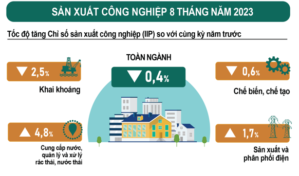 Tuy nhiên, do tình hình kinh tế thế giới những tháng đầu năm 2023 gặp nhiều khó khăn, ảnh hưởng đến kết quả sản xuất công nghiệp trong nước, nên tính chung 8 tháng năm 2023, IIP toàn ngành công nghiệp ước tính giảm vẫn 0,4% so với cùng kỳ năm trước, thấp hơn đáng kể so với mức tăng IIP của 8 tháng các năm trước.