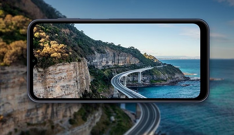 Mặt trước của Galaxy M14 5G có màn hình PLS LCD 6.6 inch, thiết kế màn hình giọt nước Infinity-V chứa camera selfie 13MP khẩu độ F2.0, độ phân giải Full HD+ và tần số quét 90 Hz, hãng chưa công bố độ sáng màn hình.
