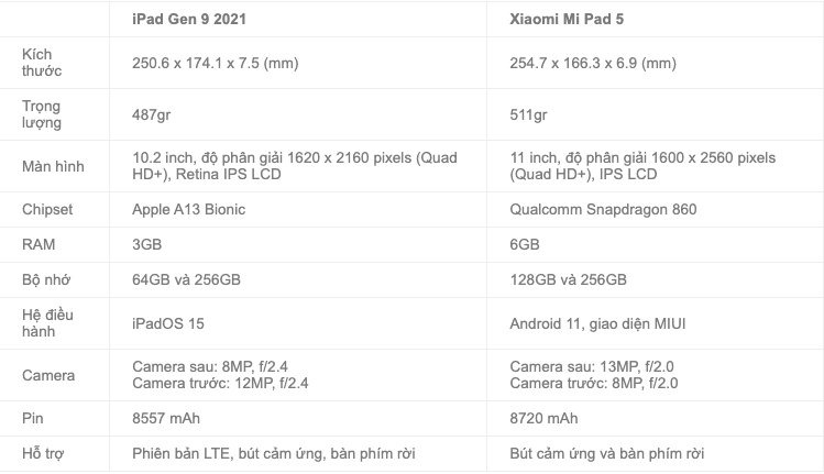 Hai dòng sản phẩm trên đều là những đại diện cao cấp đến từ 2 thương hiệu đã có danh tiếng trên thị trường. Chiếc Xiaomi Pad 5 được trang bị con chip Snapdragon 860. Trong khi đó, iPad 2021 sử dụng bộ vi xử lý A13 Bionic có sức mạnh lớn hơn đáng kể so với chip trên các phiên bản iPad Gen cũ.