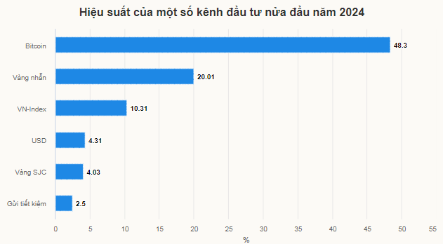 So sánh tỷ lệ sinh lời giữa kênh đầu tư vàng và gửi tiết kiệm, thì vàng vẫn hấp dẫn hơn. Theo thống kê, vàng nhẫn là kênh hấp dẫn chỉ sau Bitcoin, với tỷ lệ sinh lời khoảng 20%. Từ mức 62,95 triệu đồng một lượng bán ra vào cuối năm 2023, kim loại quý này chốt phiên cuối tháng 6 ở 75,55 triệu đồng. Trong nửa đầu năm, vàng nhẫn có ba đợt tạo "sóng", thi nhau lập kỷ lục mới. Mức cao nhất của kim loại quý này là 77,45 triệu đồng một lượng.