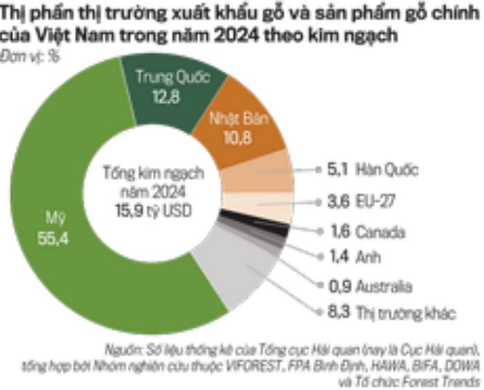 Năm 2024 ghi nhận sự phục hồi mạnh mẽ của ngành gỗ với kim ngạch xuất khẩu đạt 15,89 tỷ USD, tăng 20,1% so với năm 2023. Năm nhóm sản phẩm chủ lực gồm đồ gỗ (trừ ghế ngồi), ghế ngồi, dăm gỗ, gỗ dán và viên nén đều có mức tăng trưởng khả quan. Hoa Kỳ tiếp tục là thị trường tiêu thụ lớn nhất với tỷ trọng chiếm hơn 50% tổng kim ngạch xuất khẩu, theo sau là Nhật Bản, Trung Quốc, Hàn Quốc và các nước EU. Riêng trong quý I/2025, xuất khẩu gỗ và sản phẩm gỗ của Việt Nam đạt 3,9 tỷ USD, tăng 11,1% so với cùng kỳ năm trước, trong đó Hoa Kỳ vẫn giữ vai trò đầu tàu với kim ngạch 2,1 tỷ USD.