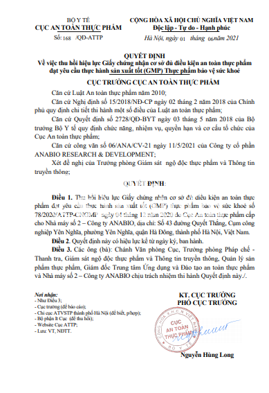 Ngày 01/6/2021, Cục An toàn thực phẩm ban hành Quyết định số 168/QĐ-ATTP về việc Thu hồi hiệu lực Giấy chứng nhận cơ sở đủ điều kiện an toàn thực phẩm đạt yêu cầu thực hành sản xuất tốt (GMP) thực phẩm bảo vệ sức khoẻ số 78/2020/ATTP-CNGMP ngày 04 tháng 12 năm 2020 do Cục An toàn thực phẩm cấp cho Nhà máy số 2 – Công ty ANABIO, địa chỉ: Số 43 đường Quyết Thắng, Cụm công nghiệp Yên Nghĩa, phường Yên Nghĩa, quận Hà Đông, thành phố Hà Nội, Việt Nam. Quyết định này có hiệu lực kể từ ngày ký ban hành.