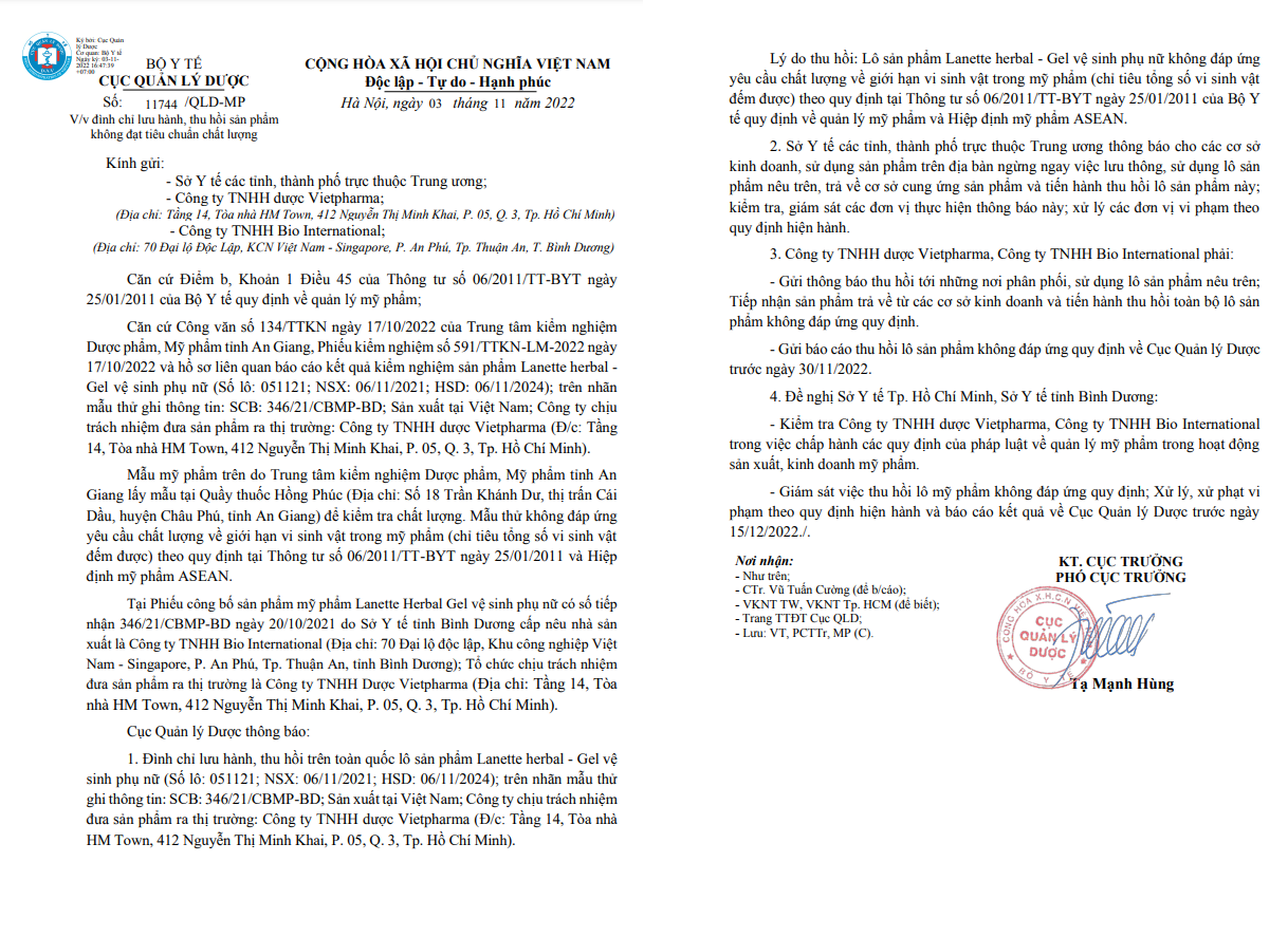 Cục quản lý Dược đã nhận được công văn của Trung tâm kiểm nghiệm Dược phẩm, Mỹ phẩm tỉnh An Giang, Phiếu kiểm nghiệm số 591/TTKN-LM-2022 ngày 17/10/2022 và hồ sơ liên quan báo cáo kết quả kiểm nghiệm sản phẩm Lanette herbal - Gel vệ sinh phụ nữ (Số lô: 051121; NSX: 06/11/2021; HSD: 06/11/2024); trên nhãn mẫu thử ghi thông tin: SCB: 346/21/CBMP-BD; Sản xuất tại Việt Nam; Công ty chịu trách nhiệm đưa sản phẩm ra thị trường: Công ty TNHH dược Vietpharma (Đ/c: Tầng 14, Tòa nhà HM Town, 412 Nguyễn Thị Minh Khai, P. 05, Q. 3, Tp. Hồ Chí Minh).