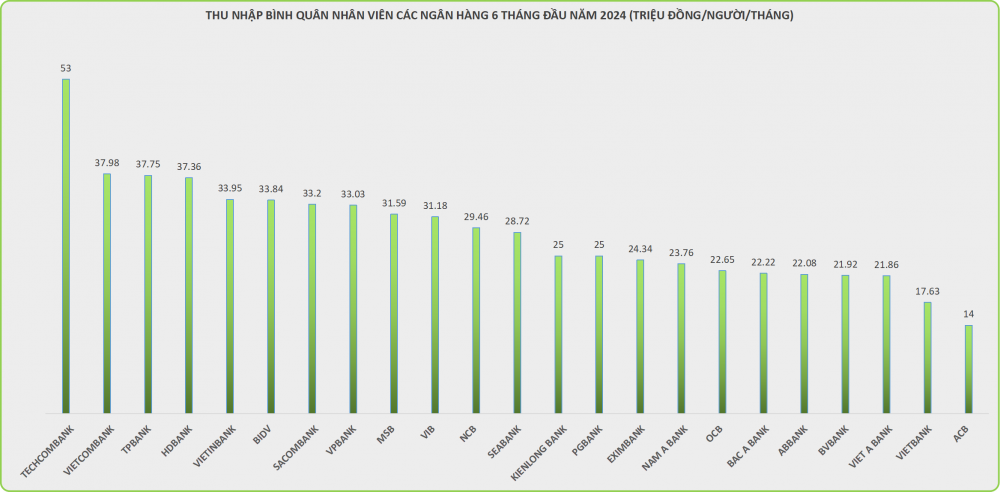 Còn tại ACB, mức lương trả cho nhân viên đứng chót bảng với thu nhập bình quân 14 triệu đồng/tháng.