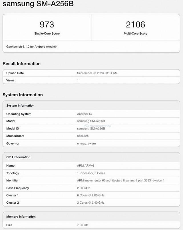 Thiết bị ghi được trên Geekbench với 937 điểm trong bài kiểm tra đơn nhân và 2,106 điểm là kết quả của bài test đa nhân với xi xử lý Exynos 1280 đã từng xuất hiện trên Galaxy A33 và A53