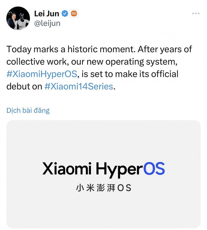 Người sáng lập Xiaomi, Lei Jun, mới đây cho biết hãng sẽ trình làng hệ điều hành Xiaomi HyperOS. Ông gọi đây là "thời điểm lịch sử" khi nền tảng này được chuẩn bị kỹ lưỡng, hứa hẹn mang lại trải nghiệm đột phá cho người dùng.