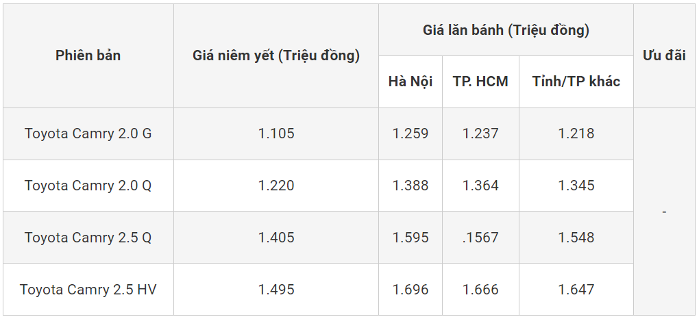 Tham khảo giá niêm yết và lăn bánh tạm tính xe Toyota Camry cập nhật tháng 10/2023