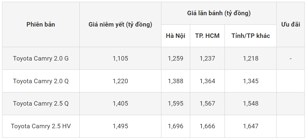 Tham khảo giá niêm yết và lăn bánh tạm tính xe Toyota Camry tháng 12/2023