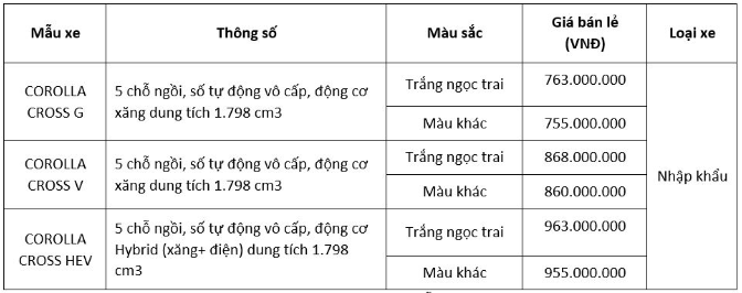 Các phiên bản nâng cấp của Toyota Corolla Cross sẽ chính thức có mặt tại hệ thống đại lý Toyota trên toàn quốc từ ngày 03/01/2023 với giá bán lẻ như sau: