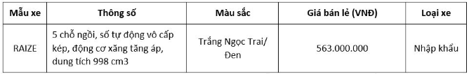 Tiếp nối thành công của mẫu xe Toyota Raize trong năm 2022 với hơn 6.200 xe được giao tới tay khách hàng trong năm 2022, Toyota đã bổ sung thêm màu ngoại thất trắng ngọc trai/ đen trên mẫu xe này nhằm tăng thêm lựa chọn cho khách hàng trẻ. Tùy chọn màu mới này sẽ chính thức có mặt tại hệ thống đại lý Toyota trên toàn quốc từ ngày 03/01/2023 với giá bán lẻ như sau: